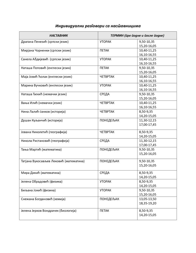 14 Sep 2019 Разредна настава Термини за индивидуалне разговоре са родитељимаНОВИ САД – РАЗРЕДНА НАСТАВА Више... Dušan Vuletić Индивидуални разговори - матична школа